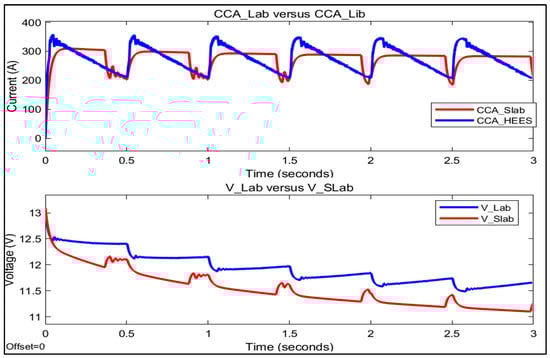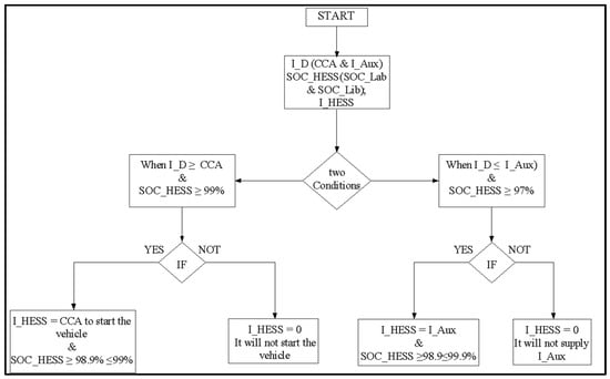 This section describes and discusses the battery management strategy development for an effective energy/power-sharing between the hybridized ESSs. The BMS proposed in this study manages the operation of HESS. The BMS is designed based on the required current and the characteristics of each battery technology. The proposed HESS with BMS operates in two modes as shown in Figure 4 and Figure 5. The discharging mode is when the HESS is supplying CCC to start the vehicle. The charging mode is when the HESS is being charged by the alternator.