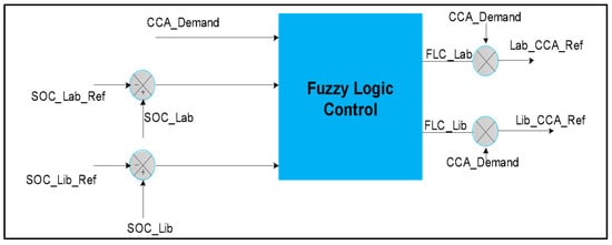 The proposed FLC for this study has three inputs (, and ) and two outputs ( and ). The FLC is designed to give the reference current based on the to limit the minimum and maximum SoC of the batteries within a certain range, and to protect the battery from deep discharge and overcharge. The FLC consists of three parts, including fuzzification, inference, and defuzzification.