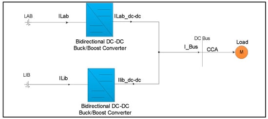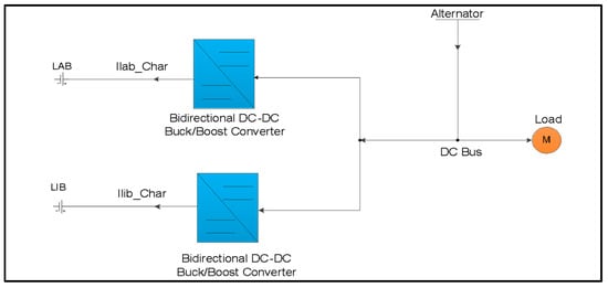 To date, many researchers have begun developing efficient, reliable, and safe hybrid energy storage systems (HESSs) to improve battery performance in terms of storage capacity and lifespan. The authors in [9,10,11,12] suggest the use of battery technology with supercapacitor/ultracapacitor (SC/UC) comprising a battery management strategy (BMS) to increase the vehicle’s performance. The SC’s/UCs could help in peak power demand during starting and energy service function. In Refs. [13,14], authors propose the hybridization of LAB and LIB to exploit their advantages. However, developed HESSs use different hybridization topologies. These topologies are classified as passive, semi-active, and fully active, respectively. According to the authors in [13,14,15,16,17], passive topology is the lowest-cost topology. However, because of different voltages between the batteries and the necessity to control the batteries’ current flow, this topology leads to high current peaks, which may cause an internal battery temperature increase and damage. Research acknowledges the semi-active topology as being crucial for energy saving, cost minimization, reaching high overall efficiency, and increasing system’s dynamics, respectively. However, a semi-active topology cannot control the current flow during the charging and discharging modes of the two batteries in different driving conditions. A fully active topology is costly, complex, and requires many control structures and optimization flexibility. Despite the topology’s disadvantages, it is suitable for the development of the HESS because individual ESSs are controlled and managed as they would prefer for a safe, reliable, and resilient system.