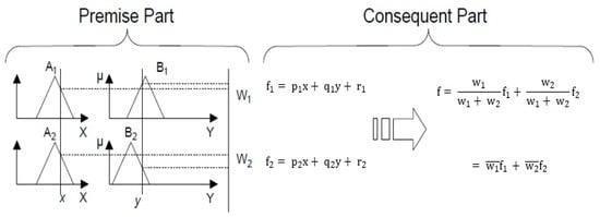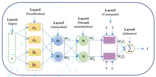 To provide a simple explanation of the ANFIS process, we can consider a fuzzy inference system with two inputs, y and x, and one output, f, and the relevant if–then (leader–follower) rules can also be considered, as follows: