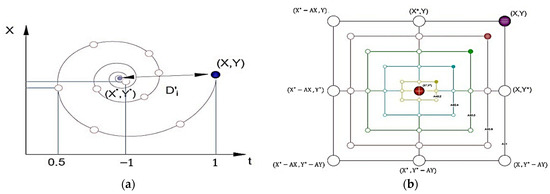 Vector , with random values between −1 and +1, is used to bring the search agent closer to the reference whale. The spiral movement and shrinking encircling mechanism are presented in Figure 3 [32].