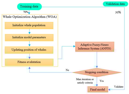 An adaptive neuro-fuzzy inference system (ANFIS) is an example of a hybrid predictive model, in which fuzzy logic and an ANN are combined to create a mapping relationship between outputs and inputs [9]. The structure of the ANFIS model is made up of five layers, each of which is made up of several nodes. Similar to ANN [10,11], each layer’s inputs are gained by the previous layer’s node in the ANFIS model. ANFIS has been found to have promising applications in the prediction of machining, material, and manufacturing process performance [12]. Among recent computing techniques, the adaptive neuro-fuzzy inference system (ANFIS) is recommended due to its capabilities for dealing with nonlinear modeling and complex stochastic datasets [13,14]. Numerous algorithms for optimizing the architecture and parameters of neural networks have been proposed [15]. The inspiration for those methods is often taken from nature—such as flocks of birds, ant colonies, or in our case, whales. Swarm-based algorithms for deep learning parameter optimization have been described in detail in several papers [16,17,18]. In the ANFIS, the dataset features are used for learning, and the system parameters are modified based on an error criterion [19,20]. The ANFIS has been successfully implemented in the prediction of renewable energy results, including in wind energy [21,22], bioenergy [23,24], and solar energy [25]. For instance, hybridized ANFIS with DE, PSO, and GA was experimented with by Hossain et al. for forecasting wind power density in the long term [26]. The effectiveness of the three hybrid models was compared in this work, and it was found that the GA and PSO hybrids of the ANFIS model had a higher performance than the DE hybrid. The ANFISPSO efficiency and effectiveness were examined for the prediction of combustion municipal solid waste’s enthalpy based on its elemental compositions by Olatunji et al. [27]. The model was evaluated using statistical performance measures, and during the model testing stage, mean absolute deviation (MAD), mean absolute percentage error (MAPE), log accuracy ratio, and root mean square error were calculated. These authors also studied ANFIS-PSO’s effectiveness in the prediction of elemental compositions from the biomass proximate values using a large dataset [28]. When ANFIS models are trained with evolutionary algorithms, the adaptive layer parameters of the model are improved, leading to a rapid convergence, global minimum error, and enhanced accuracy of the model at a lower output [29]. Nevertheless, there are some drawbacks to the ANFIS model when it is used in real applications, which are due to training the membership function parameters and weights between the ANFIS model’s layers. Meta-heuristics were used to overcome these problems. Hence, to address this issue, the whale optimization algorithm (WOA) was employed.