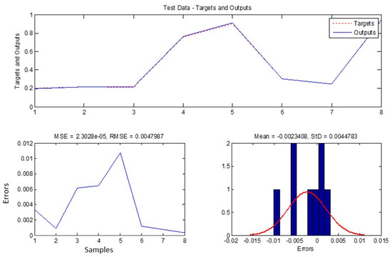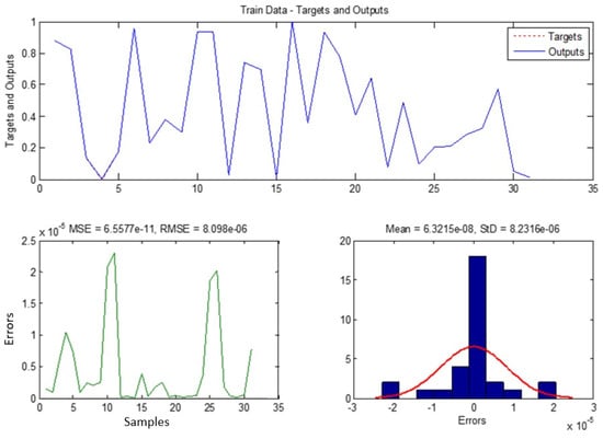 As mentioned previously, the dataset was randomly divided into two groups: the training and testing dataset. The training dataset represented about 70% of the total collected data, and the remaining dataset (30%) was used for testing. Figure 5 and Figure 6 and Table 2 indicate the performance of the WOANFIS method against training and testing data. Figure 5 and Figure 6 show the MSE of trained and tested data for WOANFIS’s performance. The distribution of errors was regarded as a normal distribution with an approximately wide variance. The average RMSEs of the WOANFIS training and testing data were found to be 0.00008 and 0.00479. In these figures, the target and the output values are compared, and the model error value was calculated for the data. These results show an acceptable development for the newly proposed method.