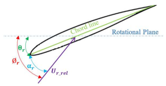 The sectional angle between the local relative flow velocity (Ur_rel) and the sectional chord (cr) of the blade is termed the local angle of attack (Uαr) and is given as