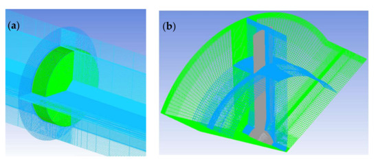 Only one-third of the rotor was constructed each time utilizing both MATLAB and ANSYS 19.1/ICEM. MATLAB was used to ease altering the geometrical data of blade pitch angle and chord length. The blocking technique in ICEM can provide an easy way of building structured hexahedral meshes. Therefore, it was employed to construct the inner rotor domains and the outer flow domain volumes. The grids were assigned to the edges of the blocks of the two domains, with denser grids set near the rotor surfaces. Finally, the hexahedral mesh was generated and inspected for its quality. Figure 2a,b show a meshed outer flow domain and meshed one-third inner rotor domain, respectively.