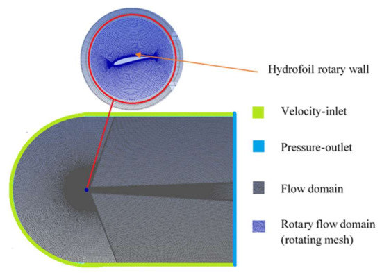 The hydrodynamic characteristics (Cl and Cd) for all used chord lengths required by the BEM model were obtained from 2D CFD models utilizing the SST k-ω turbulence model. The angle of attack, α (α = θ in 2D flow), was altered by rotating the meshes of the hydrofoil and the surrounded flow domain from −10° to 30° with an increment step of 1°. The boundary conditions for this 2D CFD model are illustrated in Figure 5. The flow speed at the inlet was set at 1.5 m/s, which was the same flow speed considered in the blockage investigation. To account for the rotational and 3D effects, the Cl and Cd were modified using models from [53] and [54], respectively. These rotational and 3D effects were made based on a hydrofoil located at 80% of the considered blades spans as this was the recommended design span [41]. The modified Cl and Cd were then extrapolated over a broad range of α (±180°) using the Viterna model [55]. This broad range of α is needed by the BEM model while searching for the solution parameters iteratively.