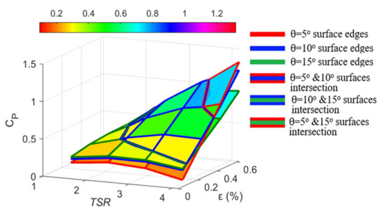 Response surfaces show the effect of ε and TSR on the performance of the highest solidity rotor (σ = 0.191) configured with different pitch angles.