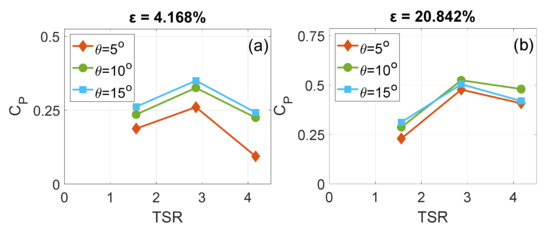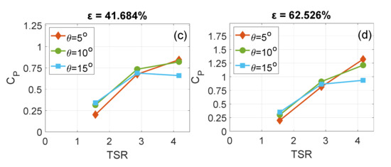 For simplified illustration, the change in CP with TSR and θ is presented for each blockage ratio separately in Figure 8. The increase and then decrease in CP as TSR increase in Figure 8a,b indicates that the CP peak was located within this range of TSR. On the other hand, this pattern of increase and decrease in the CP curve is not observed or less pronounced in Figure 8c,d, which indicates that the CP peak was not within this range of TSR at these relatively high levels of . The increase in the blockage caused a slight shift in the CP peak to higher TSRs. This was attributed to the fact that increasing the blockage (i.e., decreasing the tunnel’s cross-sectional area) augmented the flow around the rotor. Because the TSR range was fixed, the angle of attack increased (see Equations (7) and (8)), and thus larger portions of the blades’ spans were stalled. The rotors need to rotate faster to bring the angles of attack along the blades at or below the stall angle. This means the rotors need to operate at higher TSR to reach the CP peak. Additionally, in Figure 8a–d, it is clear that at the highest TSR, the smaller the θ, the faster the CP increased with increasing the ε.