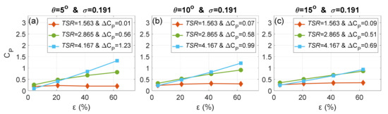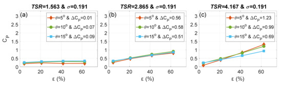 Effect of θ on how ε alters CP of the highest solidity rotor (σ = 0.191) operating at different TSRs of (a) 1.563, (b) 2.865, and (c) 4.167.