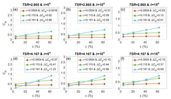 Effect of σ on how ε alters CP at: (a) TSR = 2.865 & θ = 5°, (b) TSR = 2.865 & θ = 10°, (c) TSR = 2.865 & θ =15°, (d) TSR = 4.167 & θ = 5°, (e) TSR = 4.167 & θ = 10°, and (f) TSR = 4.167 & θ = 15°.