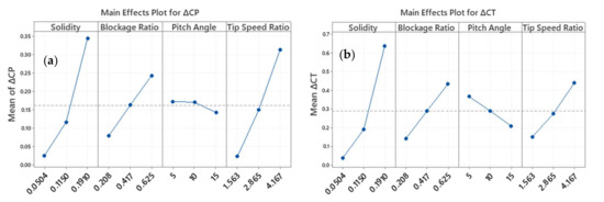 Figure 13 shows the main effects plots to inspect differences between levels and means for every factor. If various levels of a given factor influence a response variable differently, then the main effect for that factor exists. In other words, if a line in Figure 13 is tilted, then the main effect exists. The steeper the line, the larger the main effect is. From Figure 13, solidity, blockage ratio, and tip speed ratio have proportional relationships with ∆CP and ∆CT. However, the pitch angle is inversely proportional to ∆CP and ∆CT. The order of the main effect intensity of the factors on both response variables is such that solidity has the highest effect, followed by blockage ratio, tip speed ratio, and then pitch angle, which has the least effect on ∆CP and ∆CT.