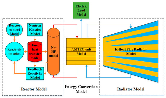 The TAPIRS code [23] was developed to analyze and evaluate the transient safety response characteristics of a heat-pipe-cooled space reactor power system. It is preliminarily verified using the steady-state design parameters of the SAIRS concept [24] and relevant subcomponents. The models used in the TAPIRS code mainly comprise the point reactor kinetics model, uranium nitride (UN) fuel pin heat conduction model, heat pipe heat transfer model, AMTEC conversion model, and radiator heat transfer model, as shown in Figure 2.