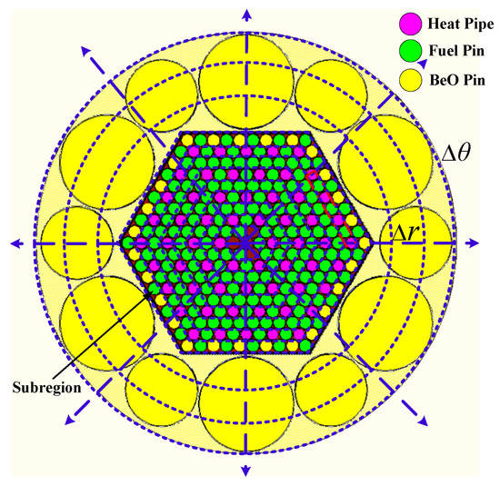 HPMR is usually designed with an all-solid core. Under normal operating conditions, the heat of core fuel can only be transferred through heat pipes. However, when a small number of heat pipe failure accidents occur, the radial power distribution is uneven. In addition, the decay heat removal of most HPMRs under loss-of-coolant accidents depends on the radial heat conduction from the core to the radial reflector. Therefore, by dividing the HPMR core into different control volumes along the radial direction and circumferential directions, a two-dimensional radial heat conduction model is established, and the heat source term of the heat pipe in the volumes shown in Figure 3 is considered. The 2-D heat conduction equation of the entire core along the radial and circumferential directions can be solved using the finite difference method. The average core temperature can be calculated as follows: