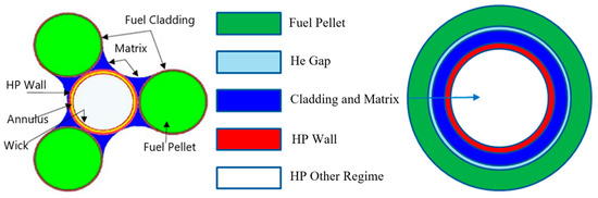 The HPMR core has various heat pipe fuel assembly layout designs, but there is a certain proportion between the number of fuel rods and heat pipes (e.g., 3:1 for the SAIRS concept, 1:1 for MegaPower, and 6:1 for SAFE), and the hexagonal core layout is used most in HPMRs. The heat transferred from the fuel pellet to the outer wall of the heat pipe passes through three layers of solid material: fuel pellet, cladding, and structural material. In order to simplify the heat transfer model of the heat pipe fuel assembly, the irregular shape of the heat pipe fuel assembly is equivalent to the annular region, as shown in Figure 4, in which the ratio of the fuel rod to heat pipe is 3:1 and the axial heat transfer of each layer is neglected. Therefore, the heat conduction equation of the heat pipe fuel assembly is given by: