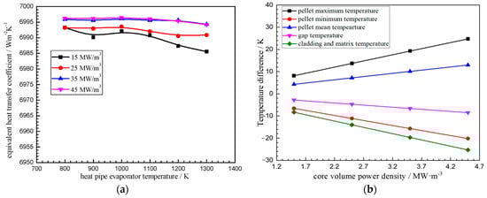 The equivalent heat transfer coefficient between the fuel cladding and heat pipe wall of the HPMR reactor depends on the assembly technology of the heat pipe fuel assembly. For a given HPMR core design, the equivalent heat transfer coefficient hhp at the interface between the fuel cladding and heat pipe wall is usually a certain value. To obtain the heat transfer coefficient, the heat transfer characteristics of the HPMR core are studied under different power and heat pipe wall temperatures by applying Computational Fluid Dynamics (CFD) software. First, the heat flux between the fuel and heat pipe and the temperature of the fuel pellet, fuel gap, structural material, and heat pipe wall can be calculated using CFD software. Thereafter, the equivalent heat transfer coefficient at the interface of the fuel subregion and its adjacent heat pipe is calculated by the average temperature of the structural material and the evaporation section of the heat pipe. For a typical HPMR (such as SAIRS), the equivalent heat transfer coefficient calculated by the CFD software remains unchanged (6995 ± 2 W/(m2·K)), even if the volume power density of the core fuel and wall temperature of the heat pipe evaporation section are changed, as shown in Figure 5a. Simultaneously, the highest, lowest, and average temperatures of the fuel pellet, air gap, cladding, and subregion structural material (Figure 3) can be corrected by the relationship between the power density of the fuel pellet and the average temperature of the subregion (Figure 5b), which is calculated by using the solid core heat transfer model. Therefore, it is possible to obtain the hot spot temperature of the whole HPMR core.