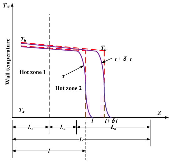 The heat pipe transient heat transfer model in the TAPIRS code mainly comprises the thermal resistance network model and flat-front model. However, the heat transfer limit of heat pipe has an important influence on the transient response characteristics of the HPMR system, which has not been considered in the transient heat transfer model of the heat pipe. Therefore, by improving the flat-front model and thermal resistance network model, considering the heat transfer limit of the heat pipe during startup and operation, a heat pipe transient model suitable for the full-stage transient analysis of the HPMR system is established. In this study, the calculation method of the hot zone wall temperature in the flat-front model was revised by dividing the hot zone of the heat pipe into two parts, as shown in Figure 6, so that the heat absorption of the evaporator section and heat transfer of the vapor flow can be considered when the heat pipe reaches the heat transfer limit [18].