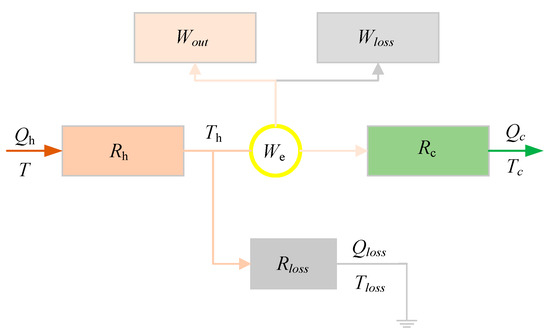 The heat energy Qh from heat source T is divided into three parts: (1) heat loss Qloss determined by Rloss to the environment, (2) work We generated from the expansion chamber to the compression chamber, and (3) heat dissipation Qc through the condensation chamber. Therefore,