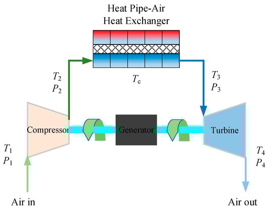 The ambient low-temperature gas is compressed to the optimal pressure by the compressor. Thereafter, the air is heated to the desired temperature by a heat pipe heat exchanger. The high-pressure air gas is expanded through a turbine to generate power. Given the inlet pressure, temperature, and flow rate of air entering the compressor, it is necessary to calculate the equations of outlet temperature and pressure of each component. Therefore, the characteristic curves of the compressor and turbine are used to provide the pressure ratio and efficiency, which are defined as follows: