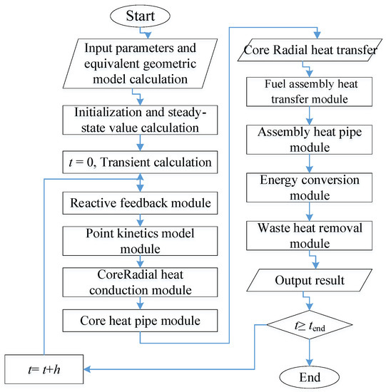 Based on the improved model described above and numerical solution methods, the HPMR transient analysis code TAPIRSD was developed with a modular programming method and FORTRAN language. The TAPIRSD code mainly comprises the main program, global solver module, input and output module, core power module, fuel heat conduction module, heat pipe module, energy conversion module, and waste heat removal module. As shown in Figure 9, the code uses a modular solution process to solve the node temperature from the core fuel to the waste heat removal component in turn at each time step, and corrects the core power by using reactivity feedback and a point kinetics model. TAPIRSD can obtain the heat transfer characteristics of the heat pipe fuel assembly in different regions of the core. The power factor of each region can be provided by user input. The temperature of the fuel assembly can be corrected by solving the heat transfer over the entire core. The improved code can be used to analyze the typical accident conditions of various types of HPMR.