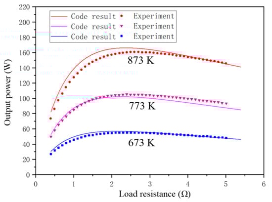 The thermoelectric conversion model was verified by Wang and Tang’s experiments on a TE semiconductor thermoelectric converter [28], which absorbs heat energy from the condensation section of the heat pipe and is cooled by a constant temperature and constant flow water heat exchanger. The calculated results of the model were compared with the experimental results, as shown in Figure 10. For different heat source temperatures of 673, 773, and 873 K, the calculated trend of the output power of the thermoelectric converter with load resistance is in good agreement with the experimental results. When the temperature of the heat source is constant, the output power first increases and then decreases with the increase in load resistance. The maximum relative error between the calculated results and experimental results is less than 8%.