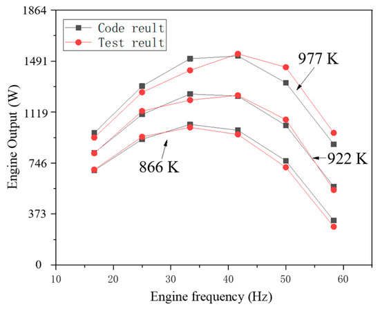 The Stirling conversion model was verified by using the performance test data of the GPU-3 Stirling engine [29]. The performance parameters of GPU-3 under different experimental conditions were analyzed by the TAPIRSD code. The output power of GPU-3 at different heater space average temperatures was calculated and compared with the experimental data in the literature [27], as shown in Figure 11. The calculated results agree well with the test results. The maximum relative error between the calculated results and experimental results is less than 5%, which shows that the model can satisfactorily predict the performance of Stirling conversion.