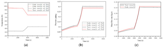Comparisons between calculated and experimental results of SBL-30 system: (a) temperature, (b) pressure, and (c) mass flow.