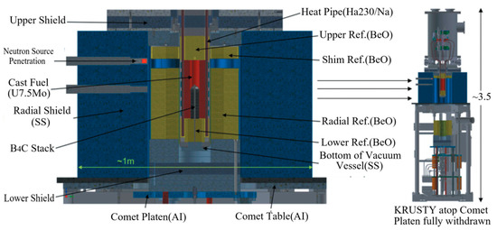 The KRUSTY reactor [31] is a 1 kW prototype test system using highly enriched uranium as fuel and heat pipe cooling, which is used to demonstrate the design of the Kilopower reactor. In March 2018, KRUSTY was successfully operated as a fission power system. The details of KRUSTY’s design together with the general design concepts and methods for all willpower reactors are described in [32]. To test KRUSTY in the vacuum chamber on the Comet, various modifications have been made, but the geometry of the fuel and heat pipe is still very similar to the Kilopower design.
