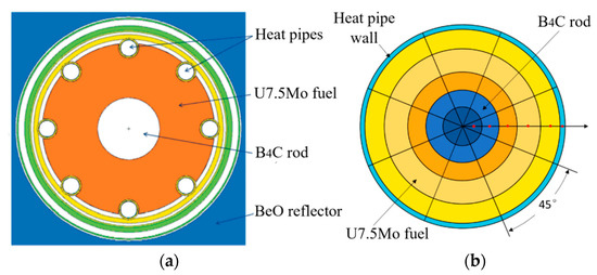 Among the microreactor conceptual designs, the heat-pipe-cooled microreactor (HPMR) uses liquid metal heat pipes to transfer the reactor core heat directly to the hot end of the intermediate heat exchanger or thermoelectric conversion device under all normal and off-normal conditions. It also removes redundant heat passively after reactor shutdown. In addition, the heat pipe characteristics of design simplicity, modularity, and integration flexibility make a very small reactor core possible. The heat pipes can provide passive cooling without pumps, valves, or primary loop piping, thus avoiding the loss-of-coolant accident conditions found in commercial reactors. In summary, the HPMR makes full use of the excellent properties of heat pipes as they are used in other areas [5,6,7], such as heat exchangers, and solar and cryogenic systems. Thus, the HPMR has the advantages of high-temperature operation, the avoidance of a single point of failure, a compact system, and a more mature technology than other concepts. For example, the MegaPower microreactor developed by the LANL Laboratory is expected to undergo prototype verification in 2025, while the Kilopower space heat pipe reactor (HPR) [8] developed by NASA underwent ground verification testing in 2018. The eVinci HPMR concept [9], proposed by Westinghouse, has been used for special purposes. Therefore, the HPMR has become the most promising microreactor technology for advanced small nuclear reactors.