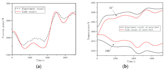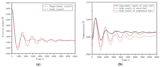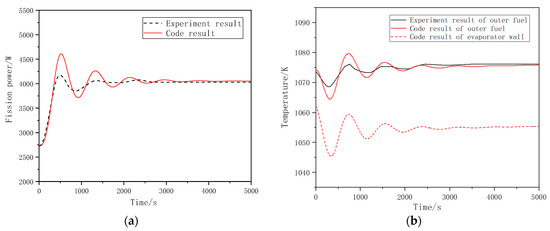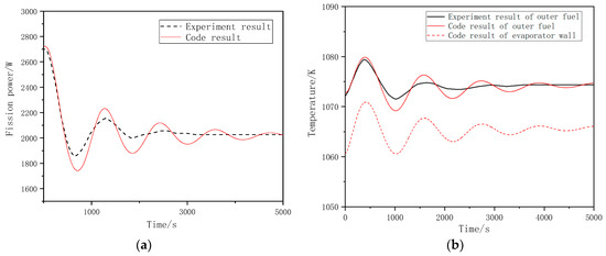 After cutting off the flow rate of the simulator, the core temperature increased quickly, causing the reactivity and power to drop quickly. Finally, a new steady-state power that matched the cooling power was achieved. The calculated temperature at the outer surface of fuel increased by about 4 K within 2 h. This occurred because the radial temperature gradient of fuel was small at a lower power level. The temperature of the inner and outer fuel and the heat pipes would become close to the average temperature, which is consistent with the experimental results.