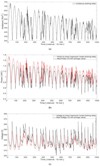 The proposed model was trained, verified, and tested using the output data from a 3 kW BIPV system and environmental sensor data. The data collection campaign ran from 16 March to 15 October 2021. Data sets with irradiances of 300 W/m2 or less were deleted. When the amount of irradiance is less than 300, the data set is inaccurate because of the frequent stoppage of the inverter, resulting in poor model accuracy. The data from 16 March to 30 September 2021 were used for model training, and the data from 1 to 15 October were used for model testing. Figure 11a shows the partial irradiance data used for training, and Figure 11b shows the partial measurement power and estimation power of the linear regression model using the I–V-measured data.