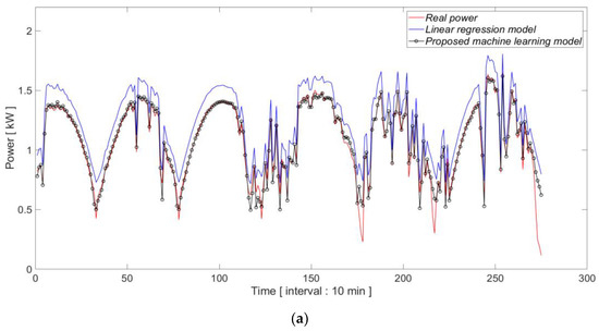 Figure 14 shows a comparison of the actual measurement data, the prediction values of the linear regression model, and the prediction values of the ML model for the testing data with irradiances of 300 W/ or more. It was confirmed that the ML model made predictions that were closer to the power, voltage, and current data than the linear regression model. Table 13 shows the RMSE and MAE of the simulation and machine learning models for the output. The result was that the RMSE of the ML model was reduced by more than 50% compared to the linear regression model. According to the analysis result, the proposed ML model can improve the accuracy of power generation predictions.