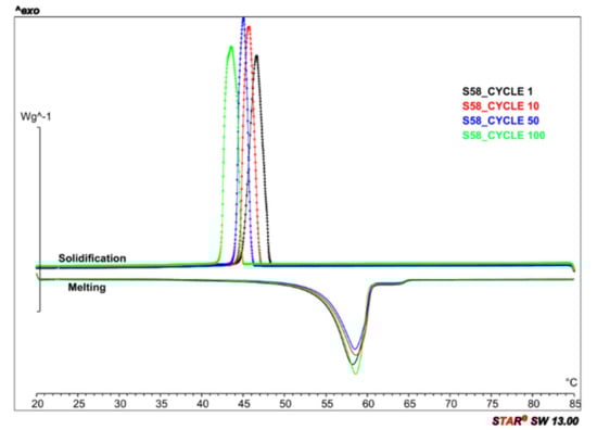 Figure 1 shows the melting and solidification peaks of the PCM S58 at 1, 10, 50 and 100 cycles. As observed from the graph, S58 suffers from a subcooling phenomenon. Therefore, the solidification temperature is lower after every solidification/melting cycle. Nevertheless, it is plausible to assert that this phenomenon is related to the low amount of PCM, 10 mg, tested in the DSC equipment. On the other side, the melting curves are stable during all the cycles. The performed analysis aimed at evaluating the actual latent heat as well as the stability of the PCM upon cycling. A summary of the obtained results is reported in