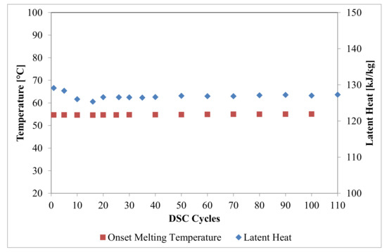 Two main parameters were evaluated, namely, the onset melting temperature and the latent heat. It is clear that the onset melting temperature was stable throughout the characterization, being around 55 °C, in line with the nominal value, since the peak melting temperature was always around 58 °C. Differently, the latent heat was almost stable at 128 kJ/kg, with some fluctuations registered during the first cycles being about 13% lower than the nominal one. Thus, a volumetric latent heat of 192 MJ/m3 can be achieved, which can still be considered attractive for the given application.
