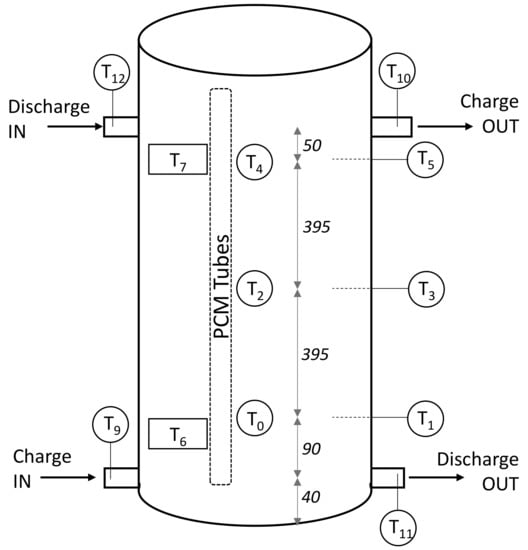 Figure 6b) for both TES under the same charging conditions, namely an initial temperature of 45 °C, an ending temperature of 75 °C and a flow rate 10 kg/min. Since no huge deviation of the temperatures measured at the same height of the tank and on the external surface were identified, in