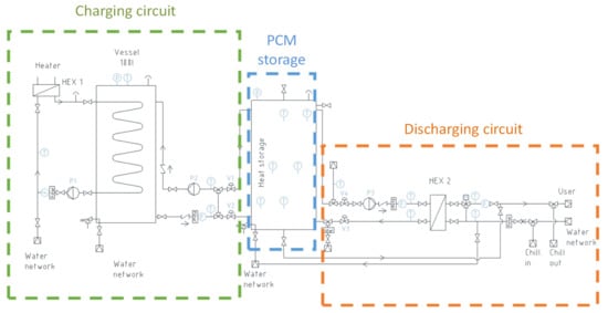 7). Finally, at the inlet and outlet of the charging and discharging circuits, Pt 100 platinum resistances were installed, which were used to analyze the performance of the storage during both charge and discharge.