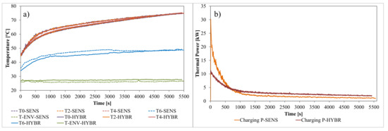 Figure 6b, the sensible TES configuration achieves a higher initial power, guaranteed by the fact that the hot water coming from the charging circuit is directly injected in the tank, pushing out the cold water. Thus, the power is extremely high at the beginning since it exploits the thermal inertia of the intermediate vessel of the testing rig and then it tends to decrease due to the time needed by the electric boiler to achieve the target temperature. Differently, the hybrid TES is characterized by a lower power at the beginning and a higher power during the following phases of the charging. This is due to the heat-transfer limitation between the water flowing into the TES and the PCM macro-capsules, which does not allow for the exploitation of the full capacity at the beginning of the charging phase and then requires a higher heating power for most of the charging phase. Interestingly, both charging processes last about 1.5 h, even if the hybrid TES stores about 12% more energy than the sensible one under these boundaries. This behavior also impacts the temperature evolution over the surface of the tank. Indeed, for both configurations, there is a temperature increase of about 10 °C during the charging, with the sensible TES initially achieving higher temperature due to the faster temperature increase, while the same temperature is attained at the end of the charging phase.