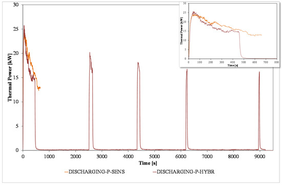 Figure 8, where the thermal power is reported. Indeed, the sensible TES discharge is about 3 kW more than the hybrid TES, which results in almost 40% more energy discharged in the first run, again in line with the higher amount of water and higher specific heat compared to the PCM. During the stand-by period, the tank was monitored. Once a plateau was reached, a further discharge was performed. The process was repeated until the hybrid TES was able to provide the required temperature to the user. This allowed, in the end, the achievement of an overall discharged energy of about 30% more than the one provided by the sensible TES. It has to also be considered that, due to the longer discharging time, the hybrid TES is also suffering of higher heat losses compared to the sensible one, as confirmed by the cycling temperature of the tank surface, as reported in