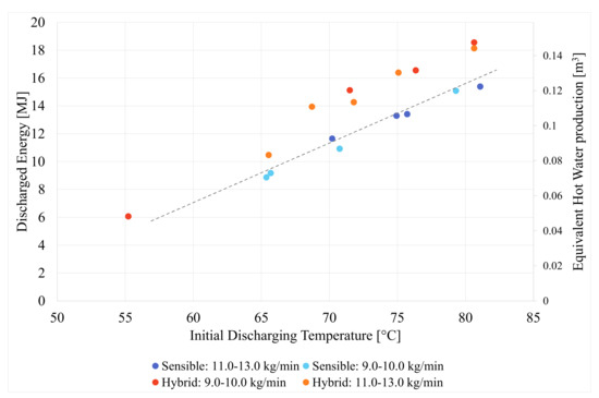 Figure 9 reports the obtained discharged energy and equivalent hot water volume as a function of the initial discharging temperature for both sensible and hybrid TES configurations. The effect of the flow rate is also considered.