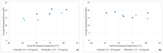 As expected, the sensible TES is characterized by an average power linearly increasing with the initial temperature, from 15 to 20 kW. This is mainly due to the temperature gradient between the stored water and the end user. Furthermore, the delivered power is slightly higher for flow rates in the range from 11 to 13 kg/min, compared to the one achieved with flow rates from 9 to 10 kg/min. This can be justified with the increased heat transfer efficiency on the plate-heat exchanger side. Differently, the average discharging power for the hybrid TES looks almost unaffected by the initial starting temperature, with a value oscillating between 15 and 18 kW. This behavior can be justified by the “dumping” effect played by the PCM inside the storage. Indeed, the presence of the macro-capsules filled with the PCM guarantees the maintenance of a quite stable temperature of the water acting as heat transfer fluid inside the tank. Accordingly, when the temperature is lower than the melting temperature, the PCM releases heat, increasing the temperature level of the surrounding water. Differently, when the temperature is higher, since the specific heat of the liquid PCM is quite limited, the temperature decrease of the water is faster than the one obtained for sensible TES, thus bringing the hybrid TES quickly close to the melting range of the PCM itself. This effect is also highlighted by the higher power obtained by the hybrid configuration at a low starting temperature (i.e., between 65 °C and 70 °C). Indeed, under those conditions, the PCM acts as a buffer during the discharge phase, thus keeping the water inside the tank warmer for a longer time, and then maintaining the high temperature difference which guarantees a higher discharging power.