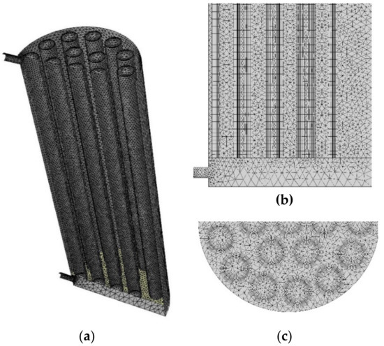 Figure 12c shows the grid on an horizontal plane at the mid height of the tank. The finite volume grid is made of tetrahedral cells with inflated prismatic cells on the interface between water and PCM bars, as can be seen in