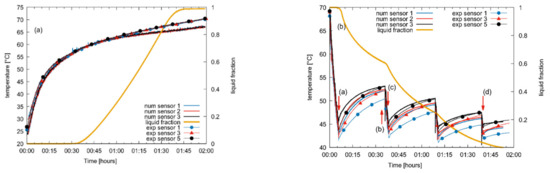 Figure 13 also reports the global value of the liquid fraction to correlate temperature evolution with PCM phase change. During the charge phase the model can accurately predict the temperature increase in the tank for up to one hour; afterwards, the temperature increase is slightly lower, reaching a temperature 3 K lower than the experimental one at the end of the heating case. During the discharge phase (