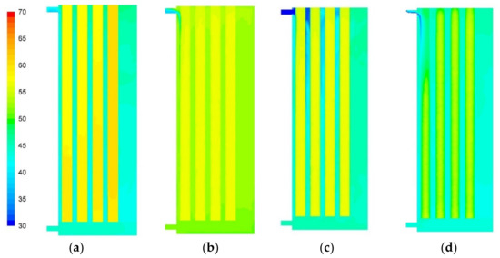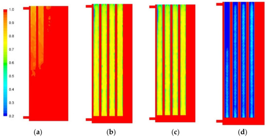Figure 14d), the PCM bars show a lower temperature, and the PCM has nearly completed the solidification, losing the possibility to reheat the water again. The evolution of liquid fraction inside the PCM bars during the discharge phase can be observed in