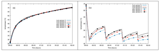 Figure 13b), stratification can be identified, and the results are quite similar to the ones obtained by the experimental setup. This also highlights that in a perfectly mixed water tank, the PCM bars trigger the water stratification during a reheat phase. The numerical results are in accordance with experimental results with similar temperatures after the reheat phase. The temperature differences between numerical sensor three and experimental sensor five at the end of the reheat phase are −0.045 K, 0.109 K and −0.11 K respectively at the end of the first, second and third reheat phase. For the other sensors, the highest difference is between numerical sensor one and experimental sensor one at the end of the first reheat with a difference of 1.82 K.
