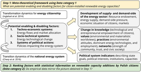 Two-step research method, confronting two types of empirical data. Data category 1 describes the Polish energy system (see Table 1). Category 2 has empirical data on citizen-installed renewable energy capacities (Table 2) [20,21].