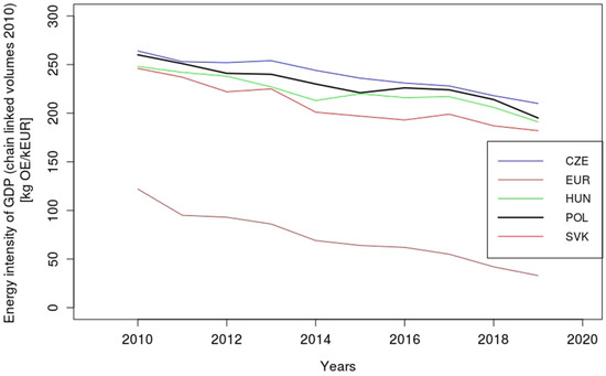Energy intensity of GDP (2010–2019). Source of data: EUROSTAT [38].