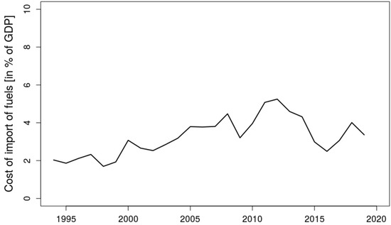 Cost of energy imports compared to GDP (1994–2020). Source of data: EUROSTAT [38].