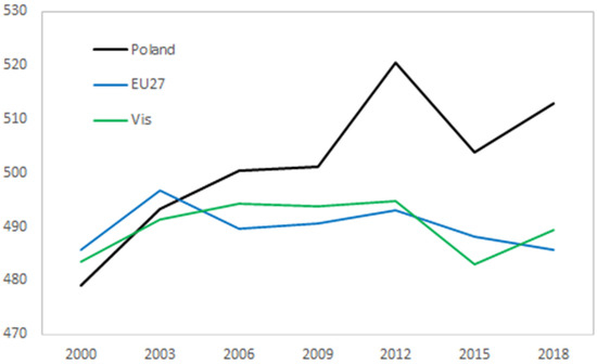 The results are the following. As shown in Figure 8, Poland clearly stands out among EU-27 and Visegrad countries in PISA study results for young people (15–16 years). The values are highest in mathematics, reading, and science. These results from 2018 continue the trend break that began in 2000.