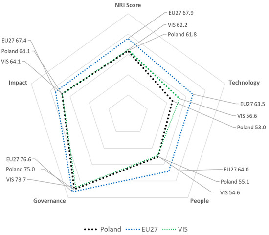 The Network Readiness Index for Poland, EU-27, and Visegrad countries is shown in Figure 9. We find that Visegrad countries and Poland systematically score lower than the EU-27 average for the dimensions ‘technology’ and ‘people’. According to the country report [32], Poland scores particularly high in 4G mobile network coverage, internet access in schools, and e-commerce legislation, whereas the country scores low for internet bandwidth, use of virtual social networks, and investment in emerging technologies. Both dimension scores result in overall lower impact and total scores for all Visegrad countries. Only the dimension ‘governance’ is comparable to the EU-level. We conclude that the direction of digital transformation in Poland (and Visegrad countries) is dominated by top-down processes, owing to the state’s dominant role in creating regulations and solutions; here, to ensure security and a high level of competitiveness of IT service markets.