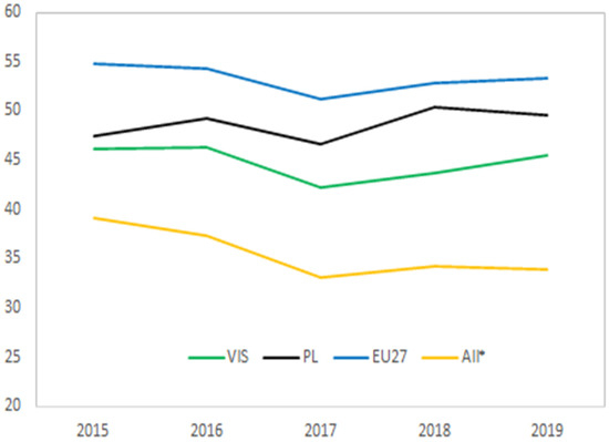In this section, we focus on understanding how technological change is occurring, along with changes in knowledge, values, practices, and networks. Therefore, variables for the socio-technical systems which we select are related to innovation systems, regimes, and niches, and technology diffusion for RE [21]. We study the dynamics occurring in Poland and compare them with other EU countries. As a benchmark, we mainly focus on the group of Visegrad countries. The rationales for choosing variables representing relevant knowledge, values, practices, and networks are as follows.