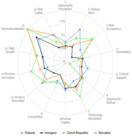 Sub-indices of the International Entrepreneurship Development Index, breakdown for the year 2020 [47].